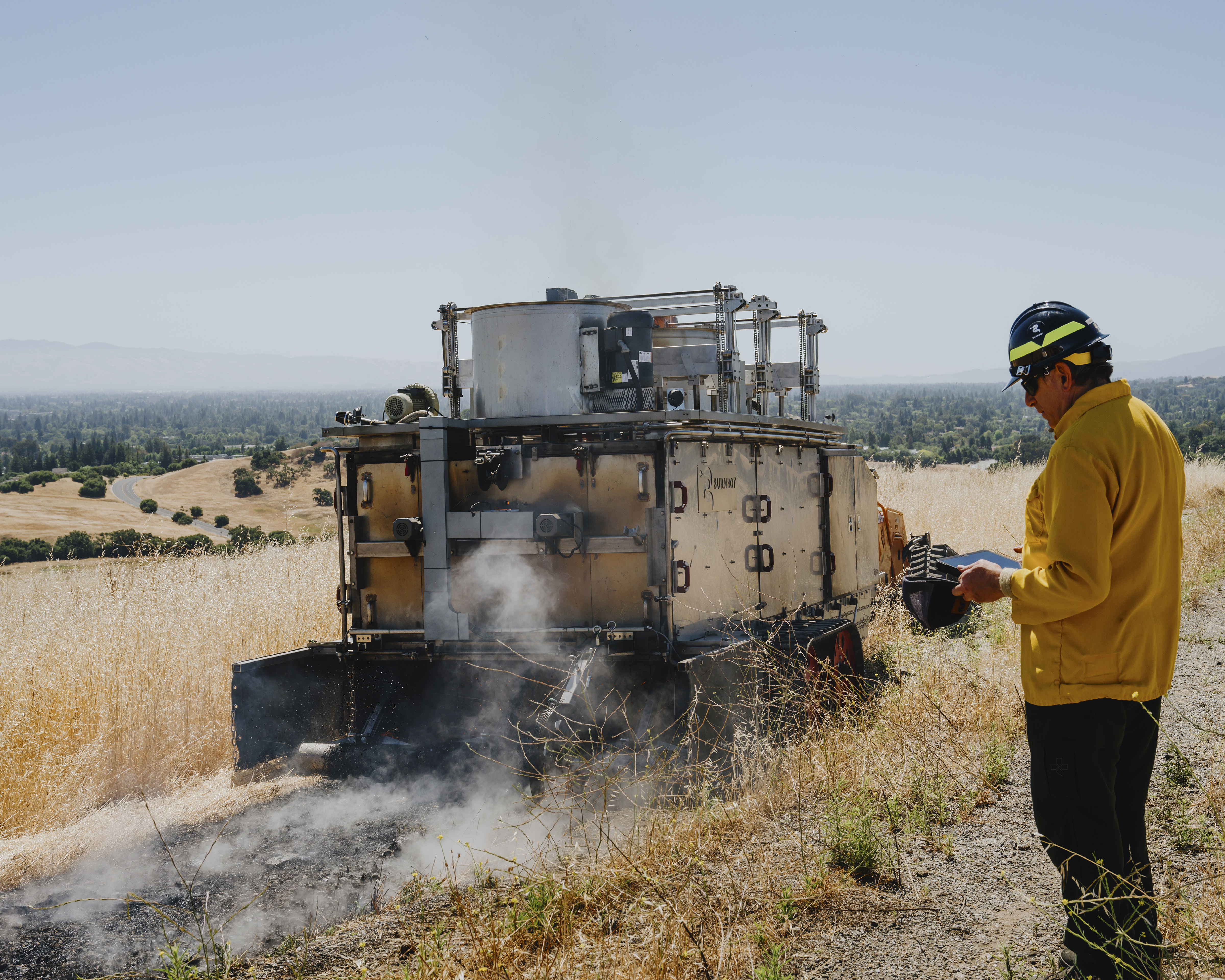 An autonomous tractor pulls the box steadily along the hillside, leaving behind the smell of cap guns and a 5-foot ribbon of charred ground, pounded flat by the machine’s cylindrical dampers and steaming from a steady spray of water. Alongside a highway, this protective line could prevent ignition caused by passing cars; checkerboarding a large stretch of land, it could allow for controlled burns that normally require dozens or hundreds of people and ideal weather conditions.
